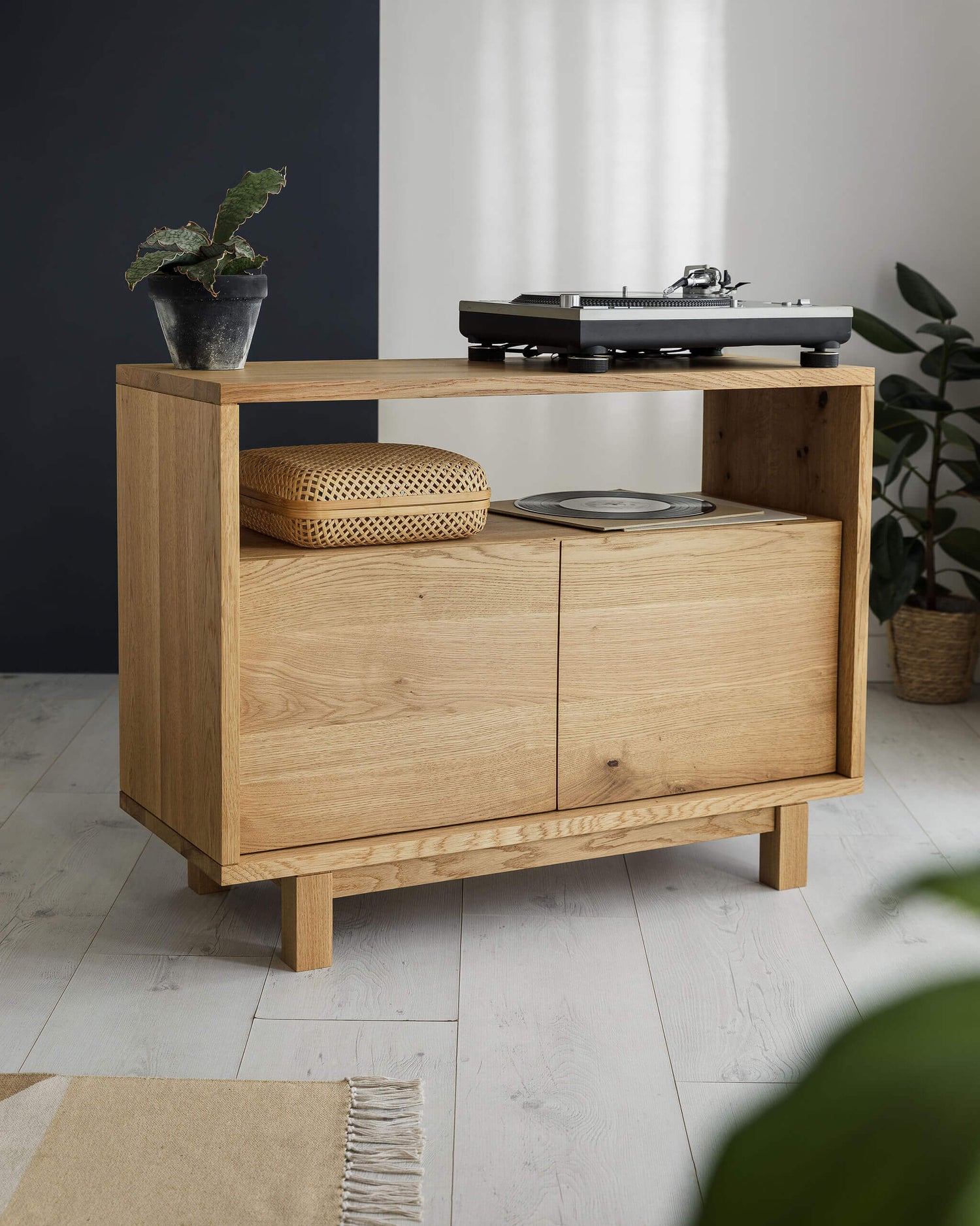 A new addition to the store, the Hazleton Hi-Fi unit with vinyl storage cabinet. Hand made to order in Bristol from solid oak, the Japandi inspired design is all about clean lines and a minimal aesthetic. A record player stand for the style concious.