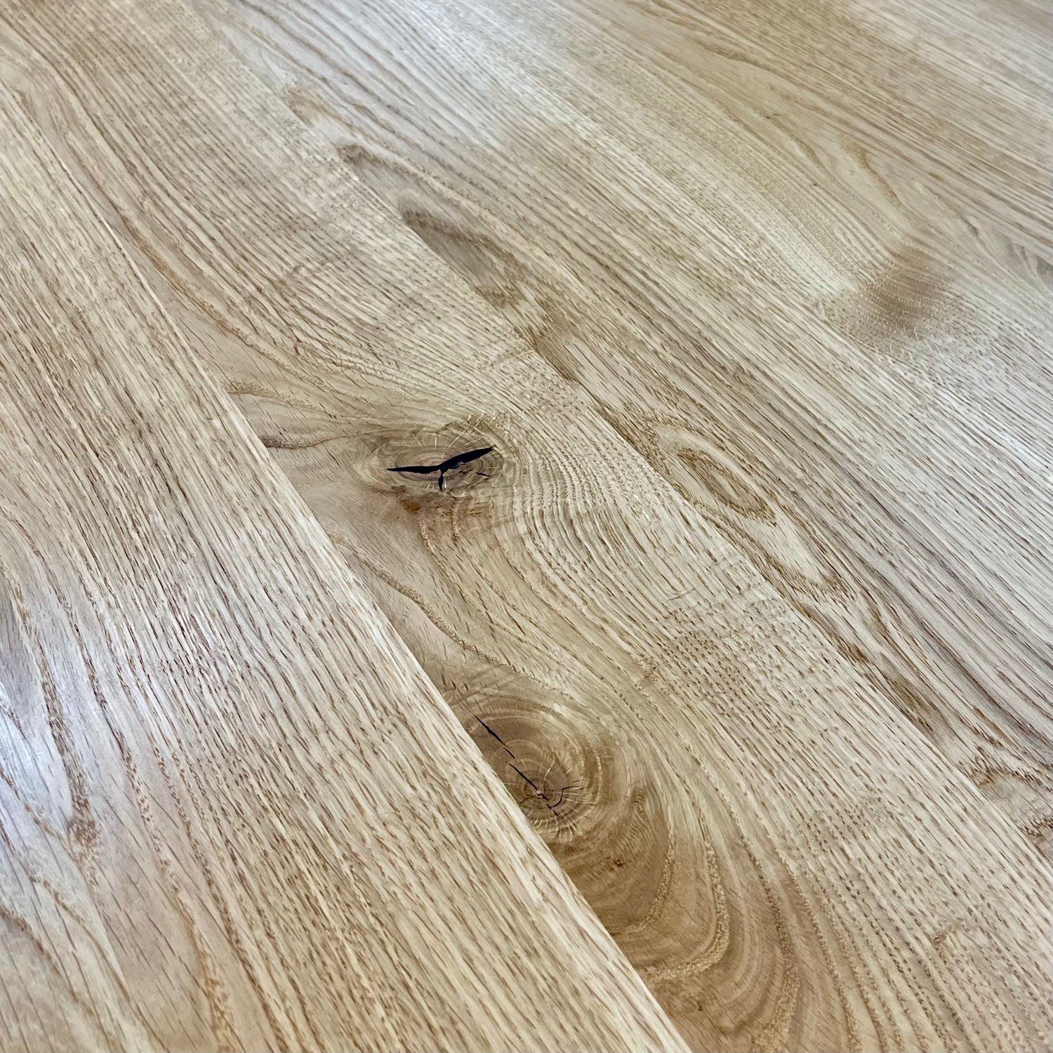 The kiln dried oak is around 25mm thick and hand picked by us. It's solid, flat and super sturdy. It's smooth to the touch and when cared for properly will last a lifetime.