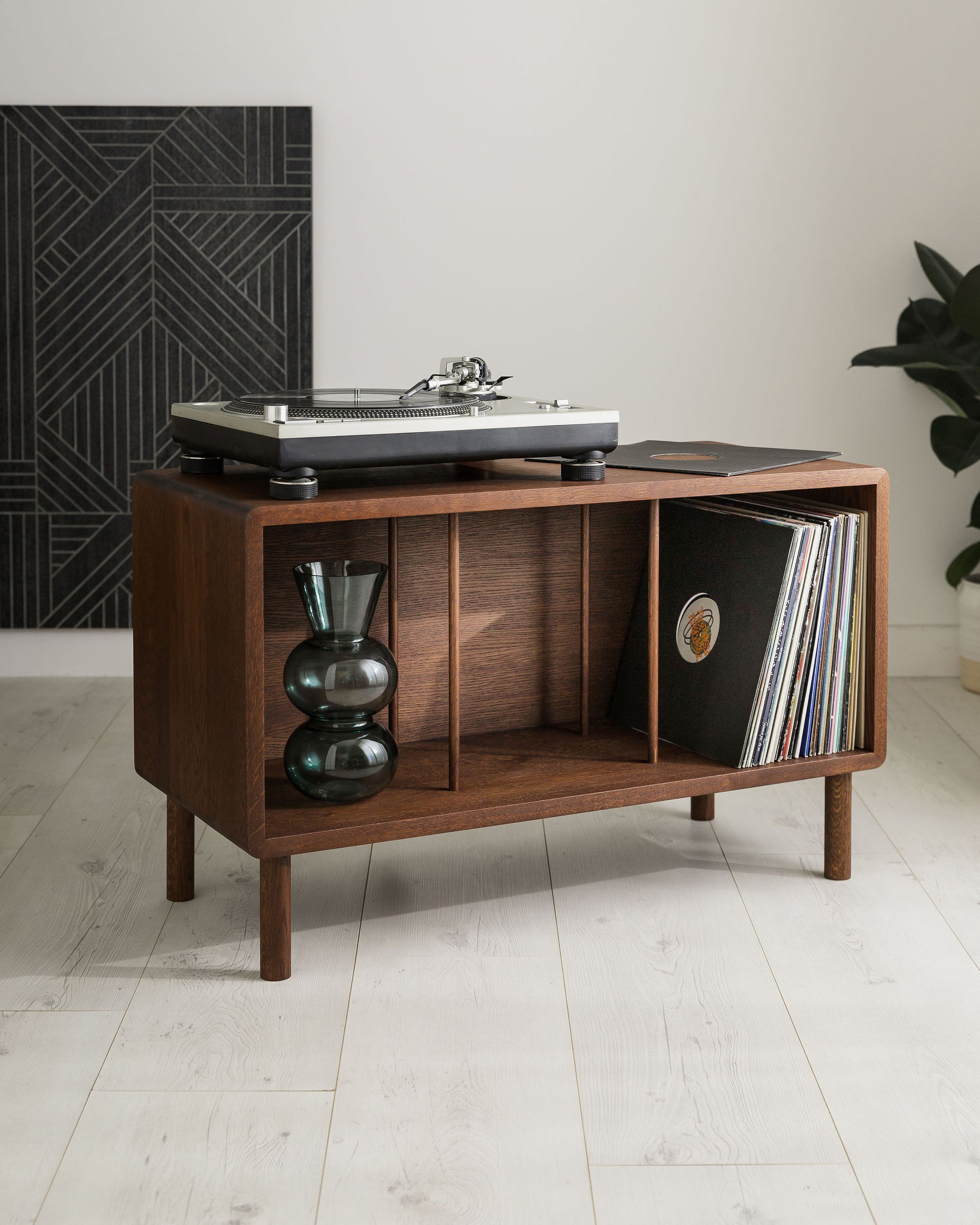 Constructed from premium European oak, this record player stand is perfect for storing your vinyl records. Its solid back design provides stability while keeping your LPs organized. With a sleek, modern look and outstanding quality, this stand is an excellent addition to any home.