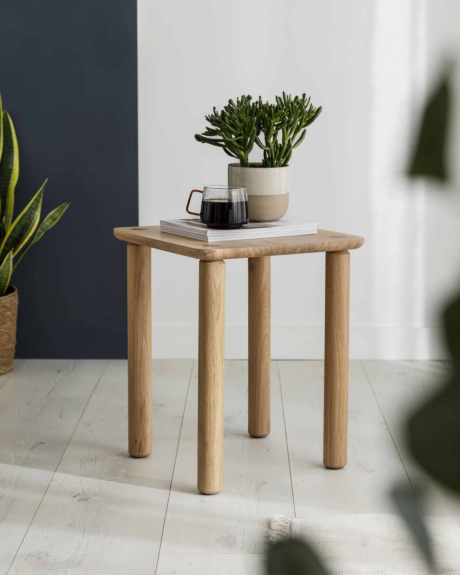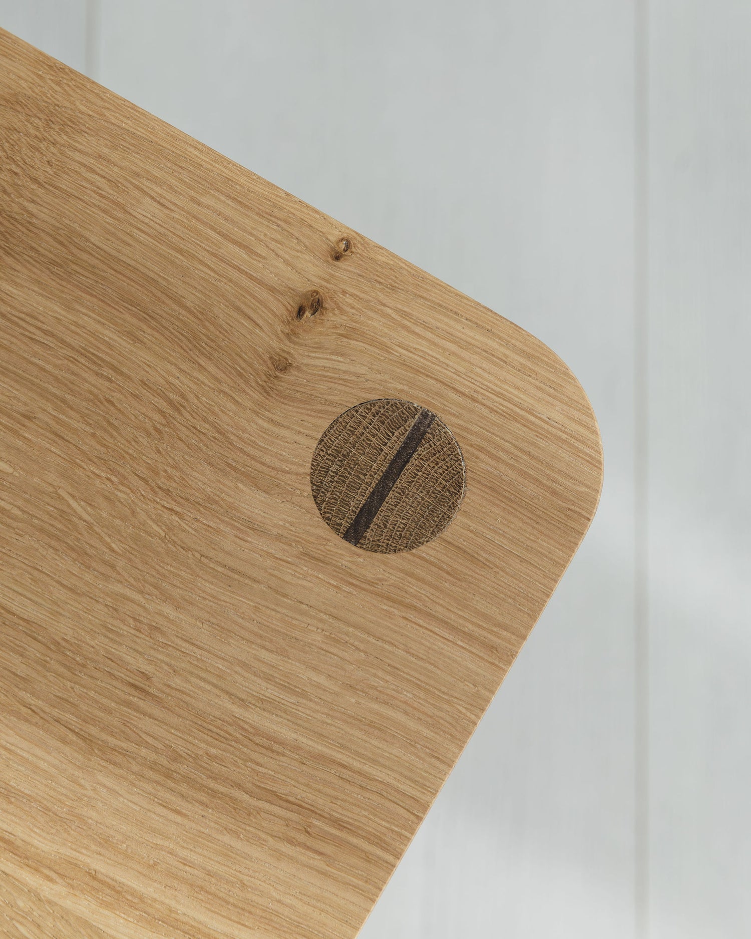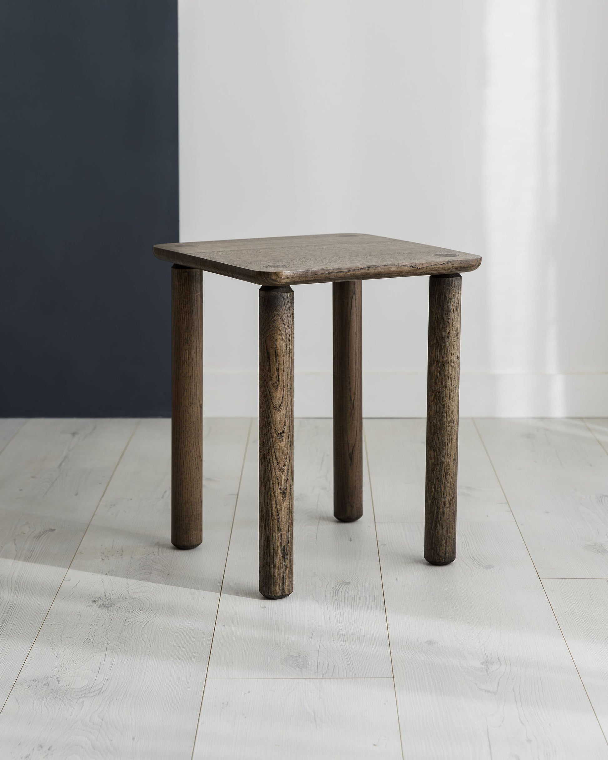 A rounded under side profile gives the top a softer feel. The top of the leg tapers into a through tenon with a slightly asymmetrical profile blending traditional woodworking technique with modern design.